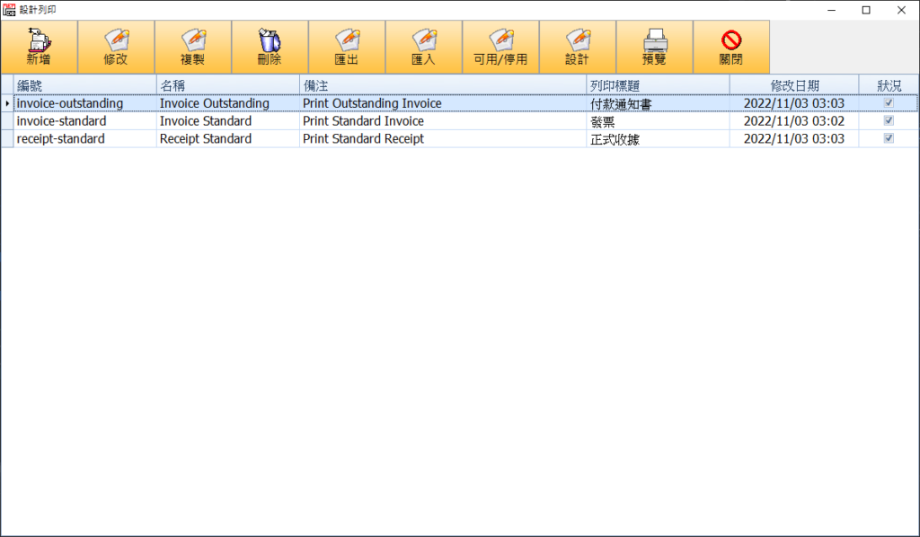 - 「類別」,customer 為客戶編號,invoice 為發票編號,contract 為合約編號,outstanding 為未付款發票編號,receipt 暫未有功能
