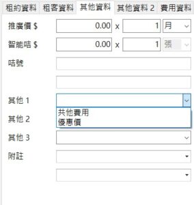 - 「租約」中加了「其他資料」,在「系統設定」中設定「租約使用額外收費」。