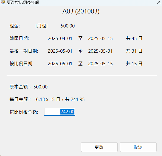 - 合約儲存後,如「合約」/「費用資料」中的最後日期與最後一期租金的最後日期不同,便會顯示按比例金額版面。